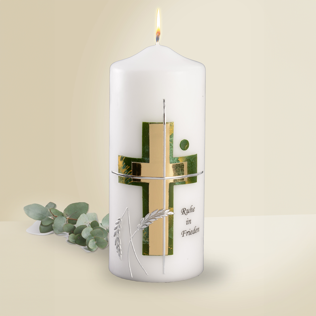 Trauerkerze mit Kreuz grün-gold, Ähren silber aus Wachs, handgefertigt.